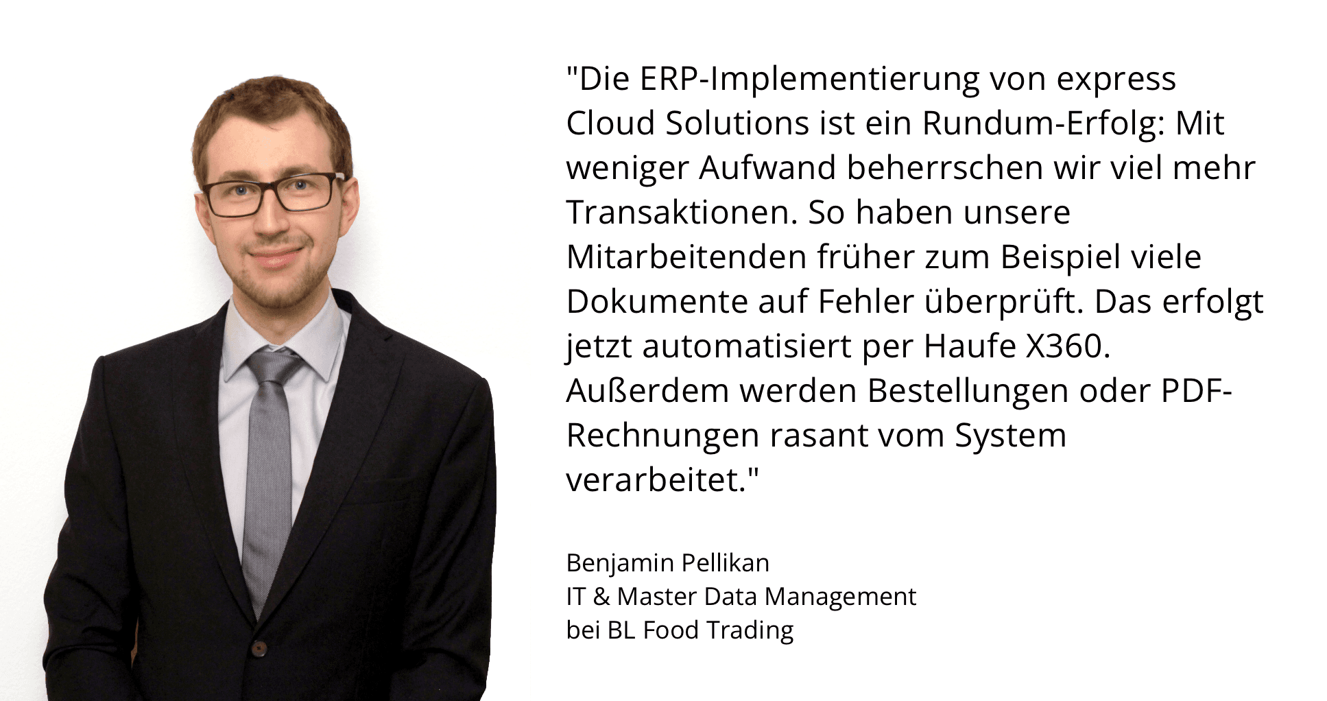 „Im Vorfeld haben wir per Workshop die Prozesse von BL Food Trading genau analysiert, wobei es für uns immer wichtig ist, zentrale Zielsetzungen zu verstehen“, betont Jörg Ackermann, unser Geschäftsführer bei express Cloud Solutions. „Anschließend geht es uns nicht nur darum, Wertschöpfungsketten abzubilden. Stattdessen bringen wir beide Welten zusammen: die Prozesse des Unternehmens und das dazu passende ERP. Am Ende greift ein Rädchen ins andere. Das Ganze ist eine Maßarbeit, in die unser ganzes Methodenwissen einfließt.“